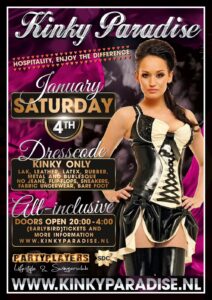 De Kinky Paradise dresscode van: lack, leather, rubber, uniforms, metal, latex, burlesque and fetish glamour, blijft die avond natuurlijk ook gewoon gehandhaafd (hoeft NIET in thema kleur).
